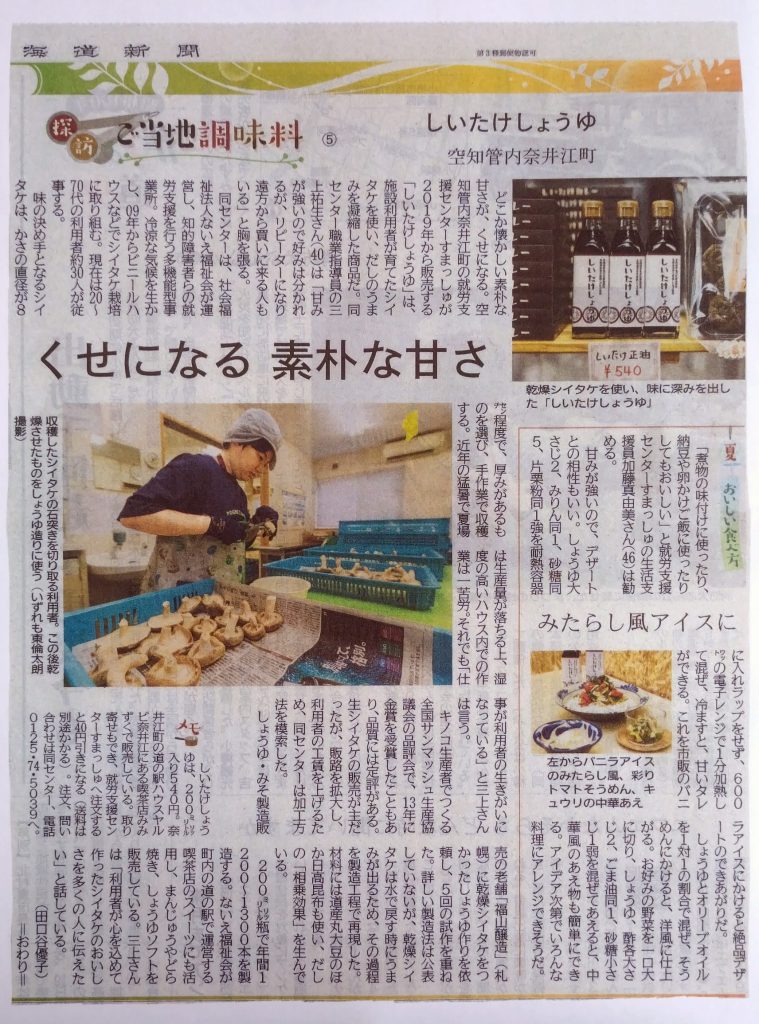 令和7年8月22日(金)発行の北海道新聞朝刊のご当地調味料紹介ページに、就労支援センターすまっしゅが販売する『しいたけしょうゆ』が掲載されました!